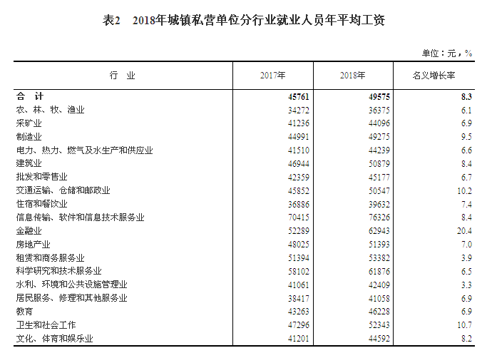 2018年全国城镇私营单位就业人员年平均工资为49575元,比上年增加3814元,名义增长8.3%,增速比2017年提高1.5个百分点。扣除价格因素,2018年全国城镇私营单位就业人员年平均工资实际增长6.1%。