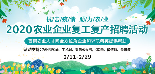 因为2020年新型冠状病毒肺炎疫情,春节假期结束后不少人仍待在家中等待企业节后复工通知,少部分企业让员工开始了“居家办公”模式。对于农业行业来说,广袤的大地,封闭的养殖场,富有科技含量的现代大棚是各位绿色产业精英们驰骋的“沙场”。随着元宵节的结束,农业行业将陆续迎来人才返岗求职和企业复工复产高峰期。在当前严峻的疫情防控下,7AHR将综合利用各个渠道为农业精英返岗求职和企业复工复产提供各类帮助,西南农业人才网定于2月11日-2月29日举行2020农业企业复工复产招聘活动。