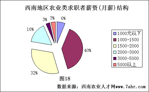 在薪资方面,多数求职者目前的薪资都集中在1000-2000元/月这个区间,其中1500左右的为主,这符合农业类企业开出的薪资。但作为技术类人才,获取到高薪的也不少,薪资位于2000-3000这个阶段占据到了16%。位于高端与低端数据基本持平,求职者薪资比较符合正态分布。