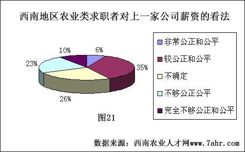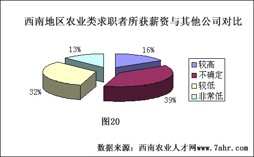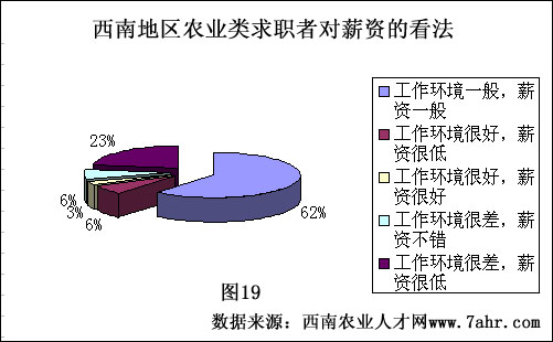 农业企业不同于其他企业的职位工作环境,一般工作环境都比较艰苦,没有高楼大厦,也没有华丽舒适的办公环境,公司为了吸引人才加入,一般在工作环境相对不是很好的情况下,多采用高薪资的方式。那么西南地区的求职者是如何看待这个问题的?62%的求职者认为工作环境不佳,薪资也一般,不过尚在可以接受的范围内。只有3%左右的求职者认为自己的工作环境好,薪资也不错。对于两个极端即工作环境好,薪资低与工作环境差,薪资高所占的比例均为6%。认为自己工作环境不好,薪资也很低的占到23%。大多数求职者都认为,西南地区农业产业发展较为缓慢,工作环境稍微差一些是可以理解的,但是企业在取得一定发展的同时,应该改善大家的工作环境以及薪资福利待遇,这样员工才觉得在这样的企业发展是自己正确的选择,同时也愿意留在这样的企业奉献自己的才华。