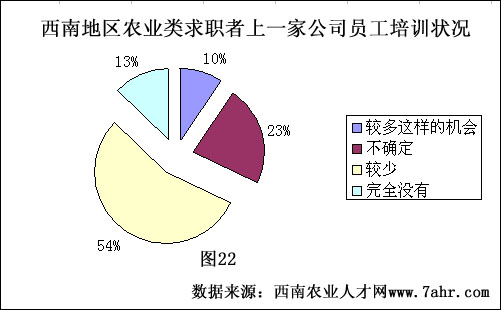 对于企业内训,认为在企业中只能获得较少培训的求职者占到了本次调查数据的54%,他们认为进入企业后基本上获得培训的机会不是很多,多数时候只能靠自己去领悟,这无疑增加了自己工作的难度,因为农业类企业是一个较特殊点企业,很多时候想找人沟通,却缺少这样的平台,自己有一些好的建议或方法也不能通过合适的渠道提出。