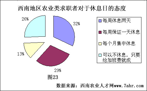 在农业领域,大家都知道,若想获取双休的确是比较难的,多数企业采取的是5.5天工作制。当然,对于双休大家都是很期盼的。本次调查32%的求职者认为每周应该休息两天,29%的求职者选择每周保证一天休息,13%的求职者选择了月底集中休息,选择这部分的多为市场工作人员,每个月多数时间都在基层,想集中抽出几天时间来放松一下自己。在本次调查中最引人注意的莫过于选择不休息的求职者,其数据占到了26%。只要企业愿意支付加班费,他们就可以不休息。在大多数还没有走上正规化的农业企业,加班费基本上只能停留在口头上,虽然这与国家的相关法律法规不符,可在就业越来越难的今天以及本行业的特殊性,也只能选择默默地接受。